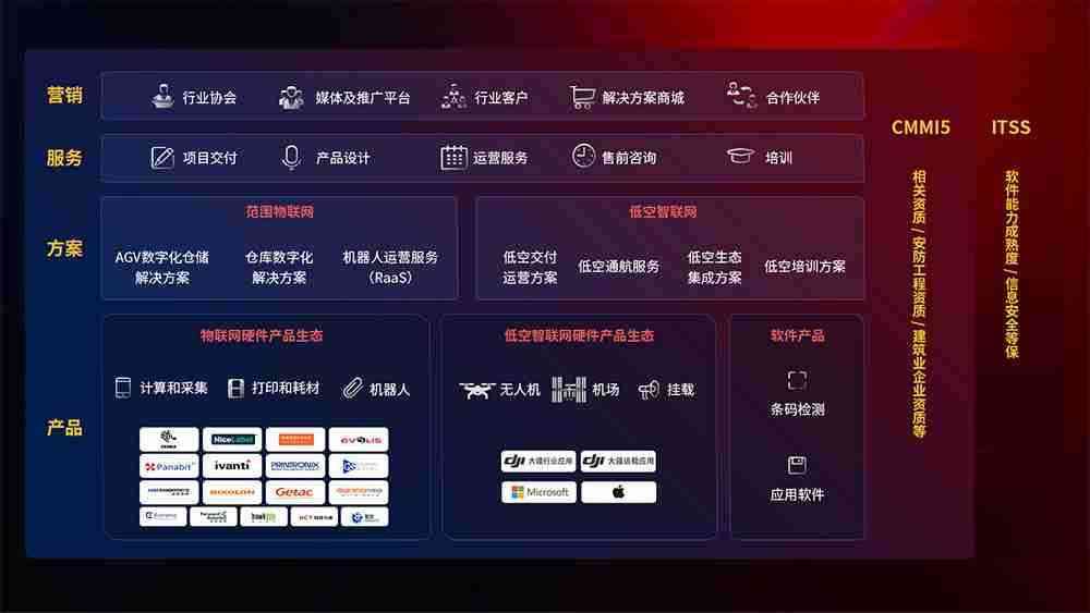 聚合国内外先进的物联网硬件产品品牌,,,聚焦数字化仓储、、机器人运营、、低空智联网等领域,,,共同打造适合客户业务场景的解决方案并提供交付服务